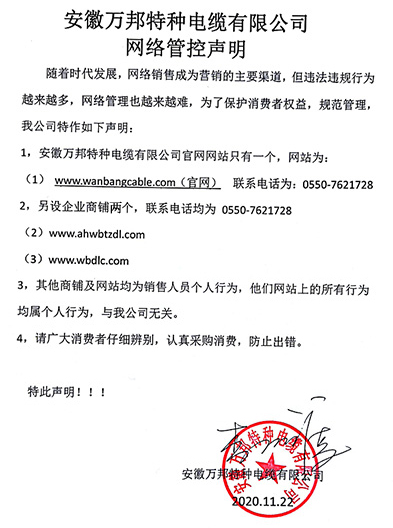 鄭重聲明:安徽萬邦特種電纜有限公司官方網站為:www_wanbangcable_com.qyhbs.com,除此之外無任何子網站或合作網站,其余均為假冒偽劣。電話:0550-7621728 13485756353 地 址:安徽省天長市滁州高新技術產業開發區經四路29號